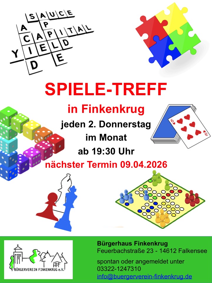 Wir laden ganz herzlich zu unserem nächsten „Spiele-Treff“ in das Bürgerhaus Finkenkrug ein. Zu diesem noch jungen Format treffen wir uns am Donnerstag, den 09. April 2026, ab 19:30 Uhr in der Feuerbachstraße 23 in Falkensee.